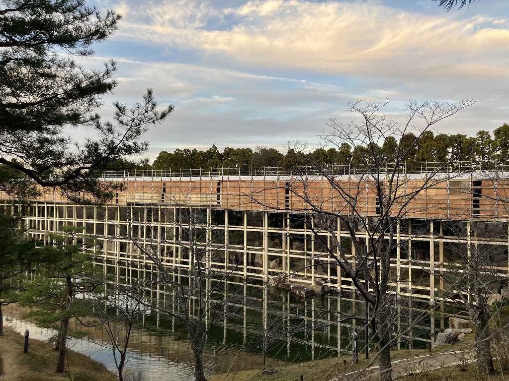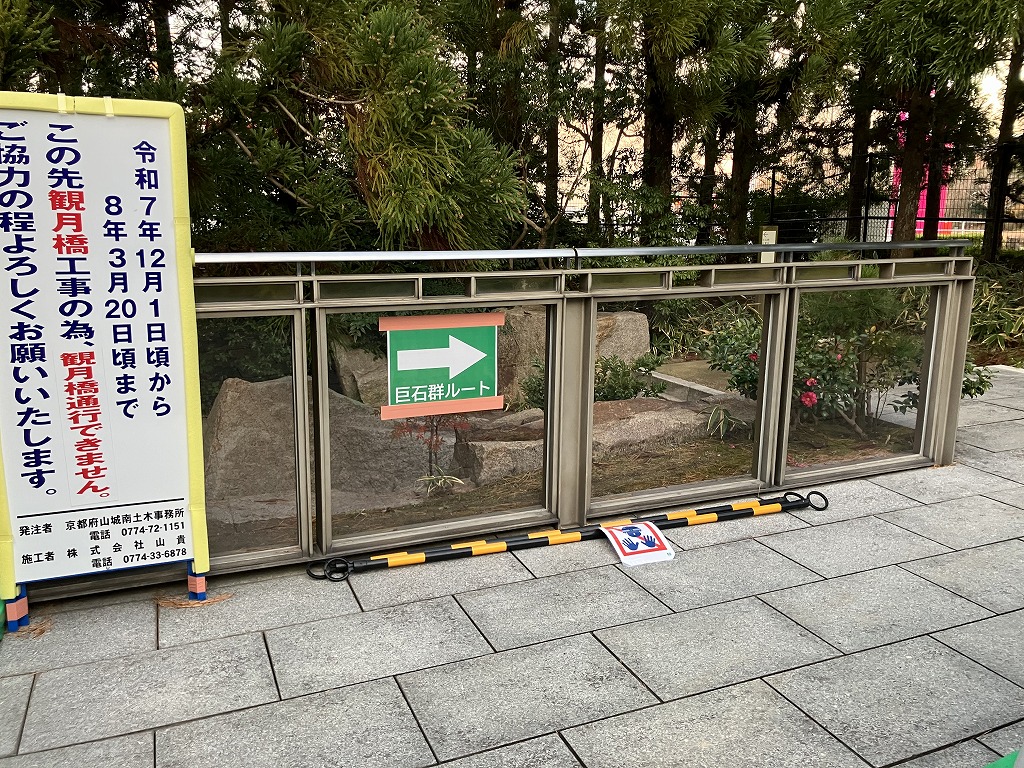 12月1日より、観月橋の床板張替工事が始まりました。2025/12/1(月)~ 2026/3/20(金)頃まで、観月橋は通行止めとなります。また、観月楼大階段も12/5(金)~2026年1月いっぱい通行止めとなります。観月楼に向かうバリアフリールートが遮断されますので、ご来園の際はご注意ください。