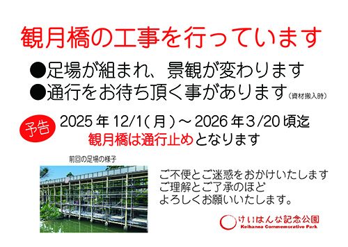 今秋より観月橋の床板張替工事が予定されています。2025/12/1(月)~ 2026/3/20(金)頃まで、観月橋は通行止めとなります。観月楼に向かうバリアフリールートが遮断されますので、ご来園の際はご注意ください。