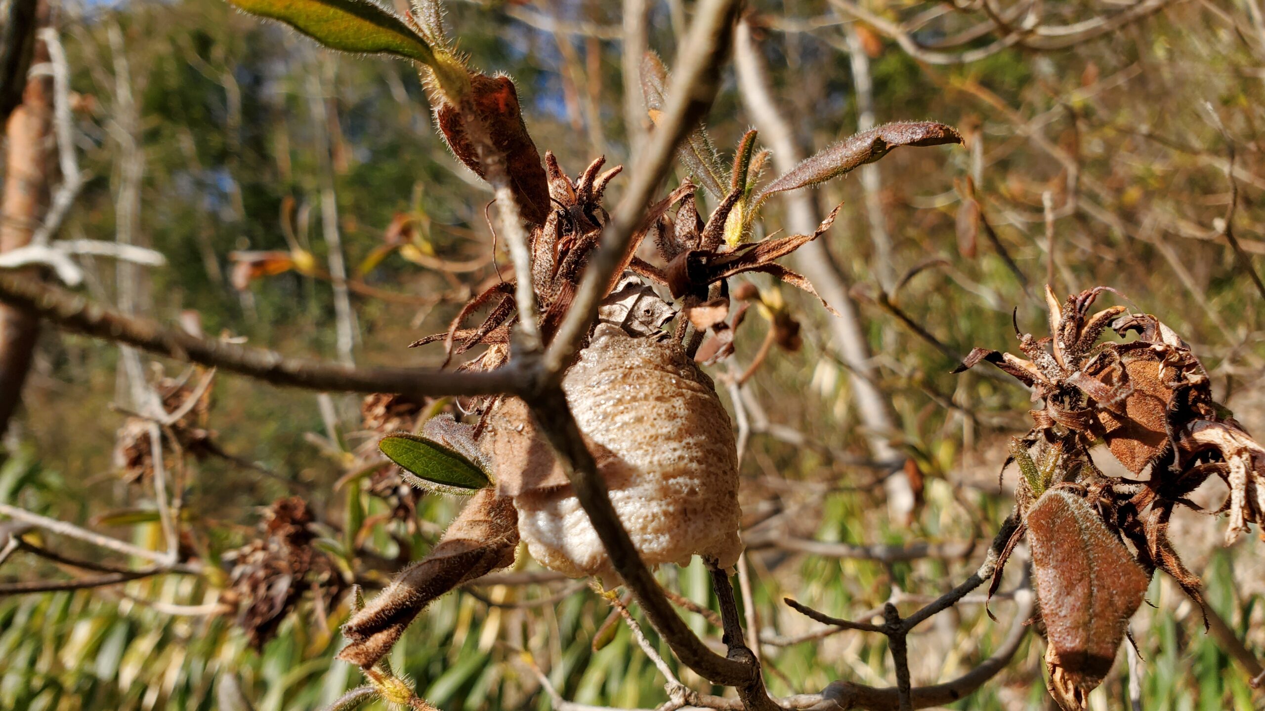 この季節、園路周辺にある植物・生きものに自然と目が行きます。越冬中の虫たちや春に向けた準備をする植物たちです。年間を通じてご来園の方は「これは秋に実が成っていた」「春に花が咲いていた」「○○の種ができている」といった季節をまたいだ楽しみを既にお持ちかもしれませんね。生き物好きな方は「冬にだけ出会える光景」にワクワクする方もあのではないでしょうか。歩くことに一生懸命になっていると気づかずに見過ごしてしまうかもしれませんが、冬には「見るものがない」わけではなく、「見つける楽しみ」がたくさん隠れている、というほうがいいようにも思います。