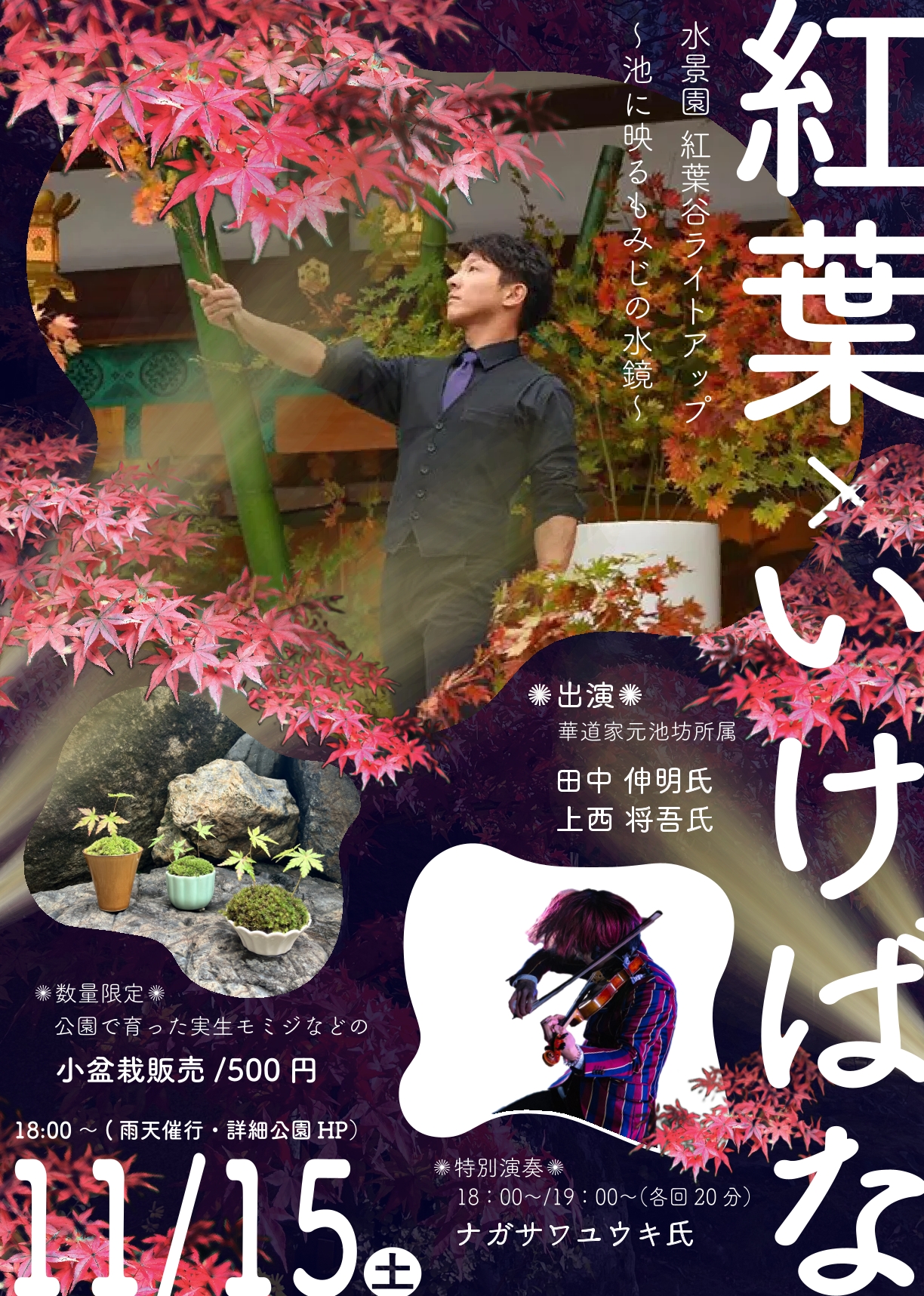 ライトアップされた水景園のモミジのなかで若手華道家による1日限定のいけばなパフォーマンスを行います。パフォーマンスのあとは、観月楼地階に移動し、池坊伝統の様式でいけられた作品の展示解説やクロストークも行います。