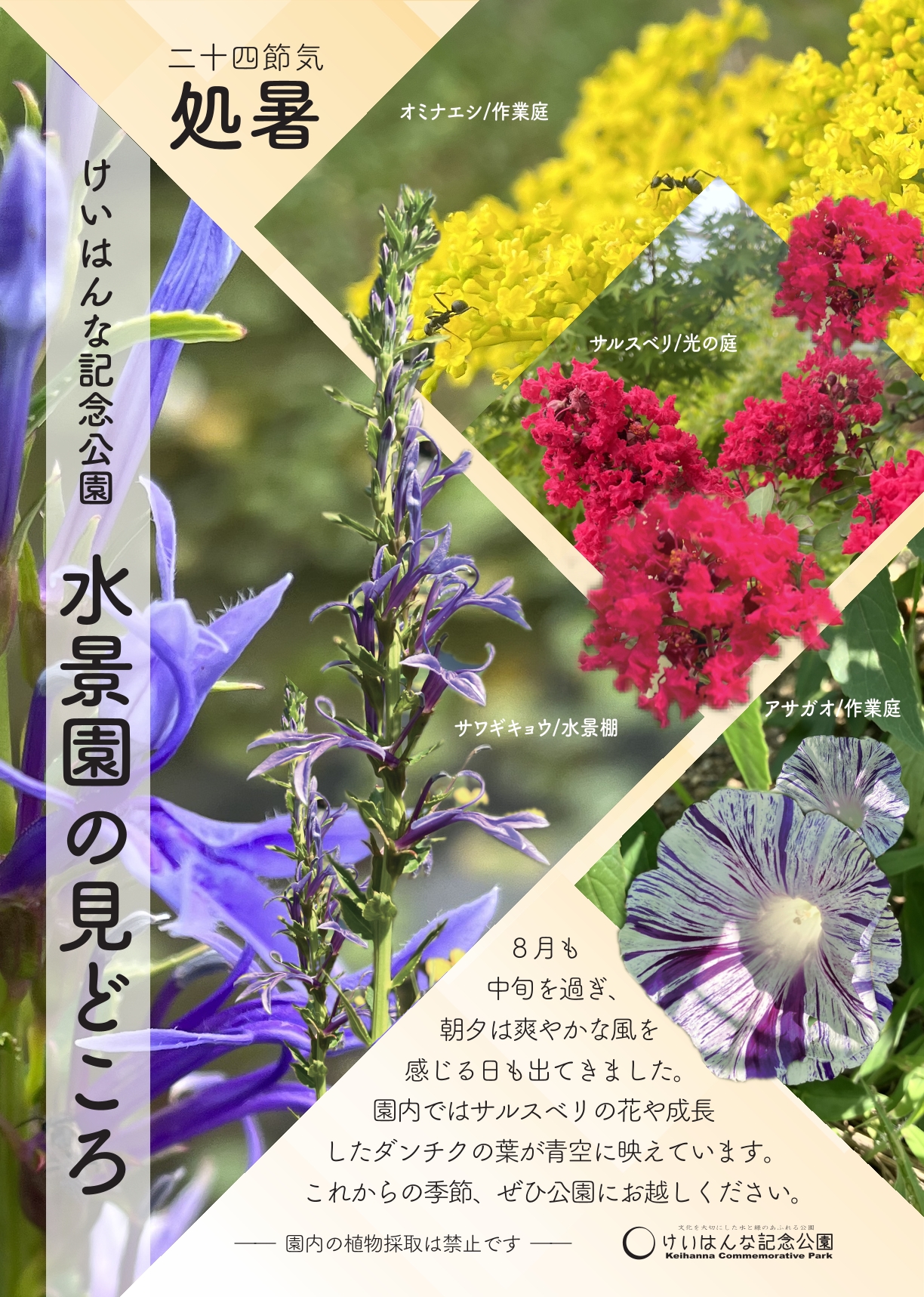 園内では、サルスベリの花やダンチクの葉が青空に映えるほどに見ごろを迎えています。
